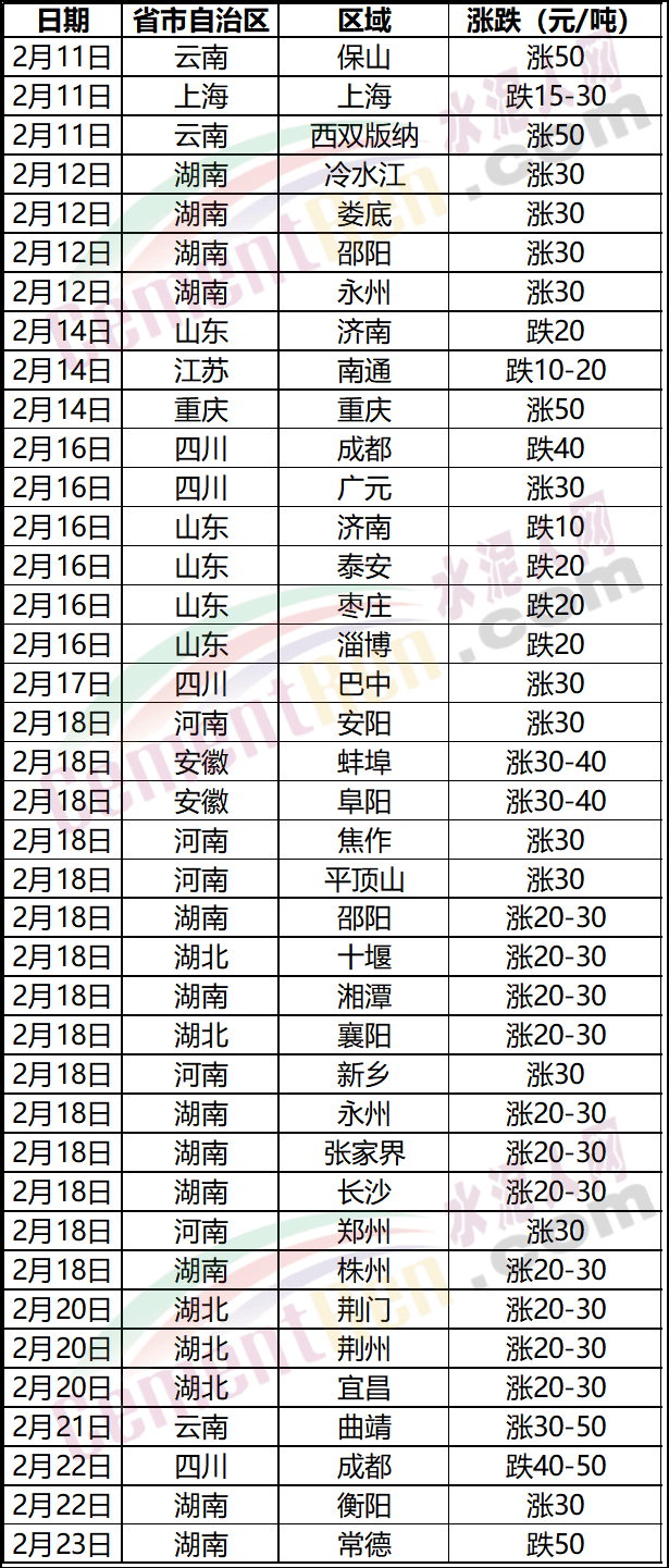 云南省曲靖漲30-50跌20元/噸,西雙版納漲50元/噸,跌30-50元/噸。