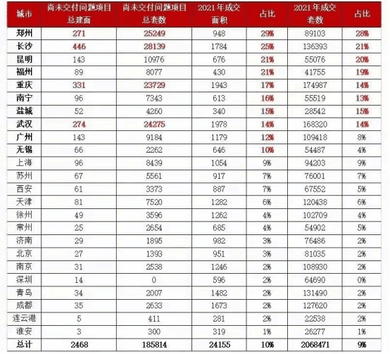 24個重點城市已停工或延期交付,項目匯總情況顯示,鄭州、長沙、昆明排名全國前三,已出問題的項目套數(shù)比例占到了2021年成交套數(shù)的20%以上;福州、重慶、南寧、鹽城、武漢,已出問題的項目套數(shù)比例占到了2021年成交套數(shù)的14%以上。如果是按照已出問題的項目面積比例占到2021年成交面積比例來計算,除前面八個城市以外,加上廣州和無錫,比例都超過了10%。濟南、北京、青島、南京、深圳、成都等城市出問題的比例較小,低于2%。