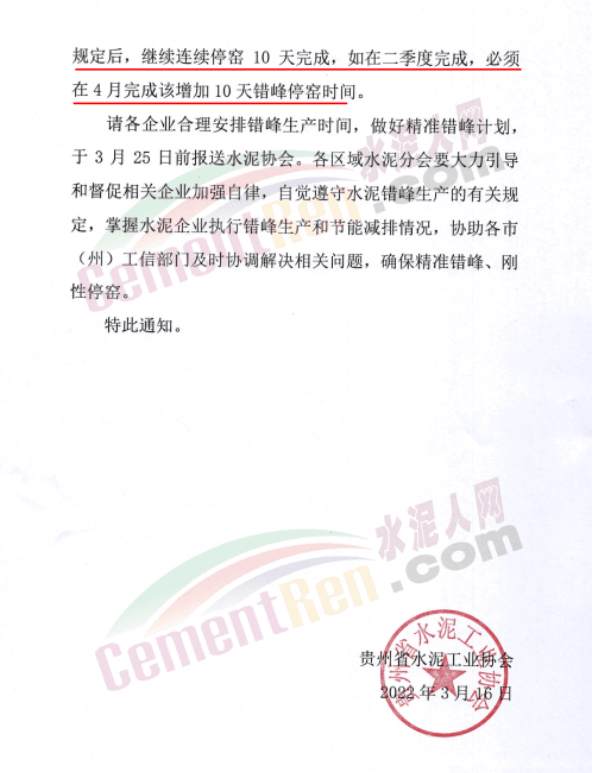 3月16日,貴州省水泥工業(yè)協(xié)會發(fā)布了《關(guān)于延長2022年二季度水泥行業(yè)錯峰生產(chǎn)時間的通知》稱,近期受煤價、油價上漲等因素造成成本端上漲,但下游需求恢復(fù)緩慢,企業(yè)庫存持續(xù)高位。應(yīng)企業(yè)要求延長2022年錯峰生產(chǎn)時間,其中二季度錯峰生產(chǎn)30天要求基礎(chǔ)上增加10天錯峰停窯時間,二季度錯峰生產(chǎn)停窯 40天。