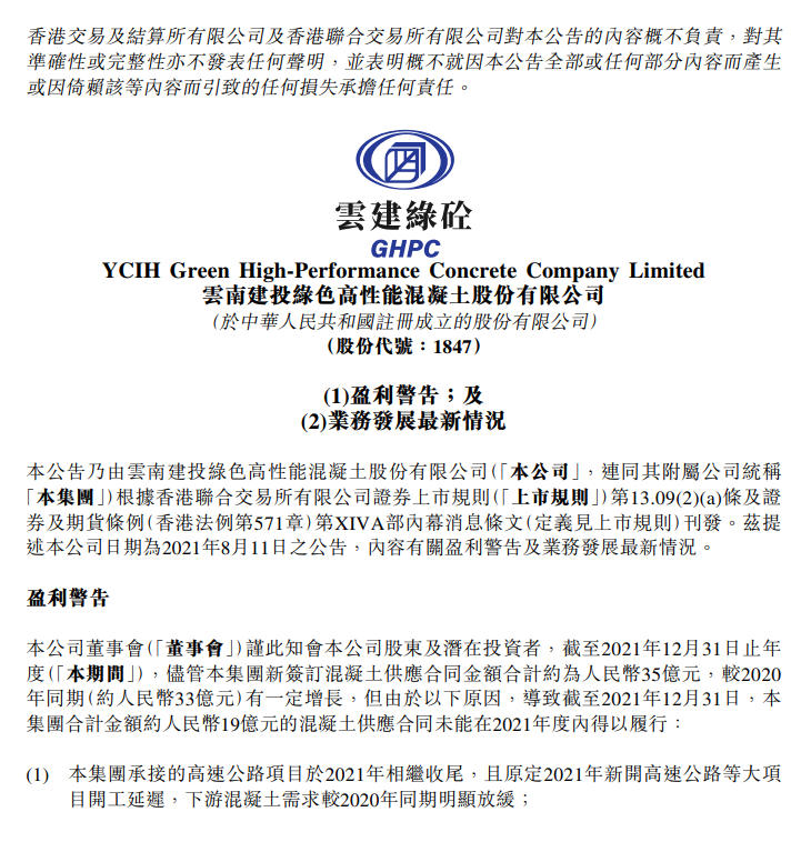 截至2021年12月31日止年度,盡管集團(tuán)新簽訂混凝土供應(yīng)合同金額合計(jì)約為人民幣35億元,較2020年同期(約人民幣33億元)有一定增長,但由于以下原因,導(dǎo)致截至2021年12月31日,集團(tuán)合計(jì)金額約人民幣19億元的混凝土供應(yīng)合同未能在2021年度內(nèi)得以履行:集團(tuán)承接的高速公路項(xiàng)目于2021年相繼收尾,且原定2021年新開高速公路等大項(xiàng)目開工延遲,下游混凝土需求較2020年同期明顯放緩。