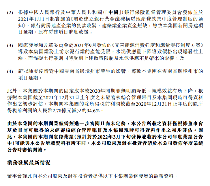 云南建投混凝土(01847.HK)公布,集團(tuán)于截至2021年12月31日止年度的固定成本較2020年同期并無明顯降低,規(guī)模效益有所下降。根據(jù)對(duì)集團(tuán)截至2021年12月31日止年度之未經(jīng)審核綜合管理賬目及集團(tuán)現(xiàn)時(shí)可得資料作出之初步評(píng)估,2021年度集團(tuán)的除所得稅前利潤較截至2020年12月31日止年度的除所得稅前利潤約人民幣2.78億元減少約94.6%。
