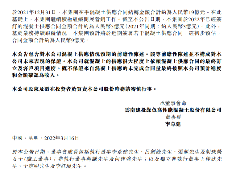 于2021年12月31日,集團(tuán)在手混凝土供應(yīng)合同結(jié)轉(zhuǎn)金額合計(jì)約為人民幣19億元。在此基礎(chǔ)上,集團(tuán)繼續(xù)積極組織開展?fàn)I銷工作。截至3月16日,集團(tuán)于2022年已經(jīng)簽訂的混凝土供應(yīng)合同金額合計(jì)約為人民幣5億元(2021年同期:約人民幣3億元)。此外,基于業(yè)務(wù)持續(xù)跟蹤情況,集團(tuán)預(yù)計(jì)將于近期簽署若干混凝土供應(yīng)合同,經(jīng)初步預(yù)估,合同金額合計(jì)約為人民幣9億元。
