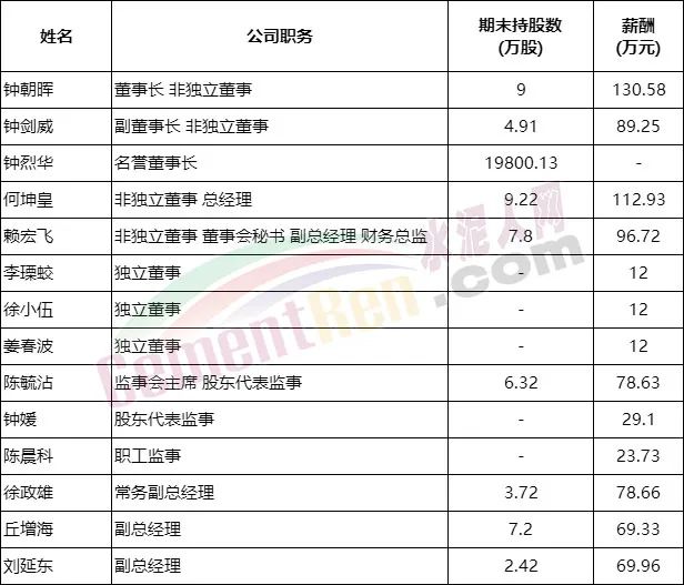 上市公司數(shù)據(jù)庫(kù)數(shù)據(jù)顯示,董事長(zhǎng)鐘鐘朝暉年薪酬130.58萬(wàn)元,副董事長(zhǎng)鐘劍威年薪為89.25萬(wàn)元,總經(jīng)理何坤皇年薪112.93萬(wàn)元,董事會(huì)秘書賴宏飛年薪96.72萬(wàn)元,年薪過百萬(wàn)高管共2人。