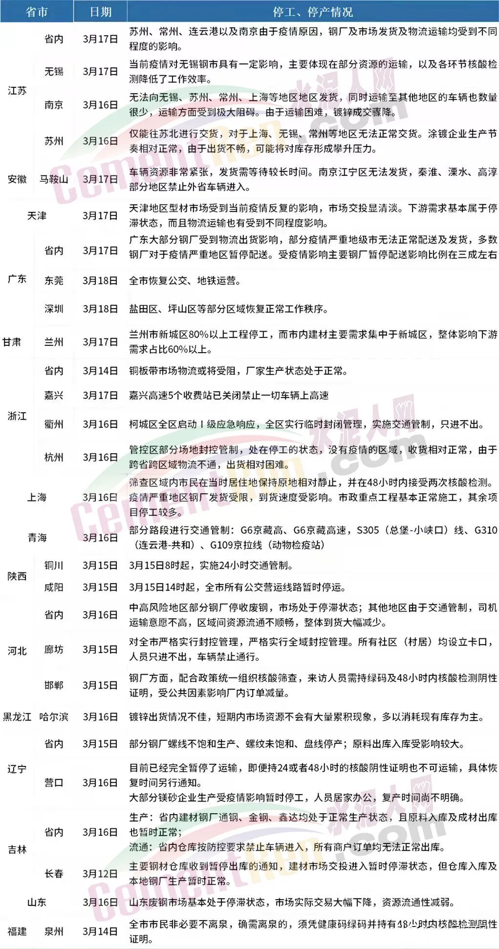 1 江蘇省內(nèi)蘇州、常州、連云港以及南京由于疫情原因,鋼廠及市場發(fā)貨及物流運(yùn)輸均受到不同程度的影響。