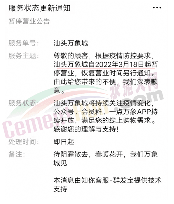 廣東深圳疫情防控指揮部發(fā)布通告稱,3月14日至20日,非城市保障型企業(yè)停止運(yùn)營或居家辦公,停止一切非必要流動(dòng)、活動(dòng),全市全員進(jìn)行三輪核酸檢測。廣東東莞全面升級(jí)防控措施,發(fā)生本土疫情的鎮(zhèn)街(園區(qū)),所有企業(yè)一律停止生產(chǎn)活動(dòng);未發(fā)生本土疫情的,實(shí)行封閉式管理的產(chǎn)業(yè)園區(qū),在嚴(yán)格落實(shí)各項(xiàng)防疫措施的前提下維持基本生產(chǎn)。深莞兩市,除保障城市運(yùn)行及供港物資貨運(yùn)的交通外,全市公交、地鐵停運(yùn)。根據(jù)通告指示,許多倉儲(chǔ)物流企業(yè)暫停運(yùn)營。深圳市金運(yùn)達(dá)國際物流表示,自2022年3月14日起,深圳所有倉點(diǎn)暫停辦理進(jìn)出倉業(yè)務(wù);城市國際物流發(fā)布通知稱,東莞集運(yùn)倉庫自2022年3月16日起,工廠停產(chǎn)停工,在此期間,倉庫暫停收貨、裝箱發(fā)貨。汕頭萬象城通知暫停營業(yè),恢復(fù)營業(yè)時(shí)間另行通知。南澳大橋臨時(shí)交通管制……