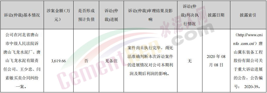 3月17日,冀東裝備發(fā)布2021年年度報告,披露了一則重大訴訟、仲裁事項,該事項涉及與唐山飛龍水泥廠的合同糾紛,具體如下: