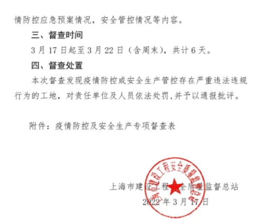 根據(jù)市住建委發(fā)布《進(jìn)一步統(tǒng)籌做好本市建設(shè)工程疫情防控和安全生產(chǎn)工作的通知》(滬建質(zhì)安〔2022〕169號(hào))文件稱,總站即日起對(duì)本市建筑工地開展疫情防控及安全生產(chǎn)專項(xiàng)督查工作。