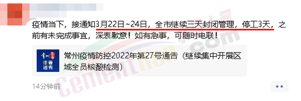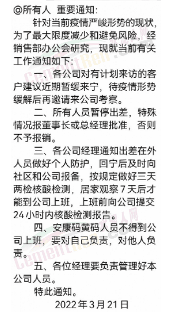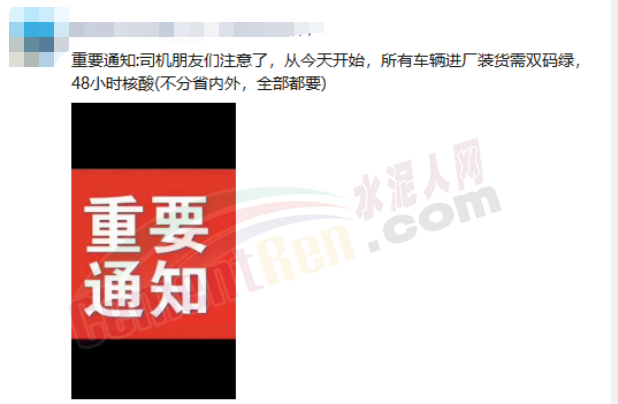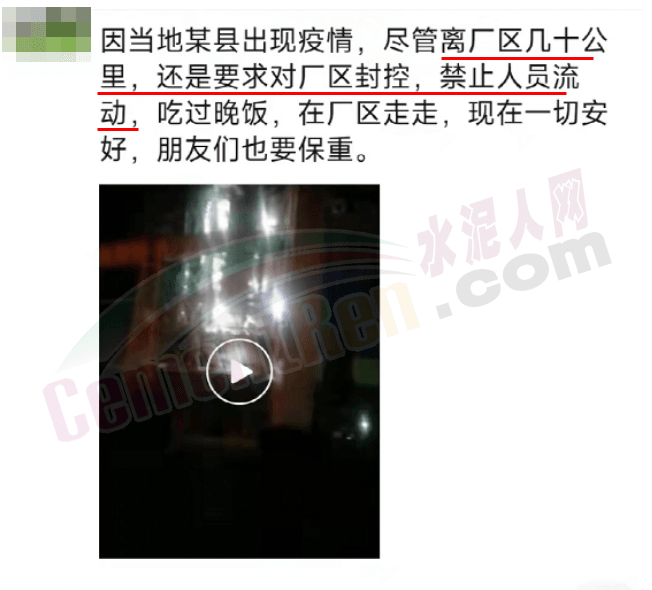 有網(wǎng)友發(fā)消息稱,因當(dāng)?shù)啬晨h出現(xiàn)疫情,距離水泥廠熟料基地幾十公里,但仍要求對(duì)廠區(qū)進(jìn)行封閉管控,禁止人員流動(dòng),不許進(jìn)出。