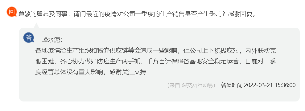 有投資者在上市平臺(tái)向上峰水泥問及疫情對(duì)公司一季度的生產(chǎn)銷售是否產(chǎn)生影響時(shí),上峰水泥回復(fù)稱,各地疫情給生產(chǎn)組織和物流供應(yīng)鏈等會(huì)造成一些影響,但公司上下積極應(yīng)對(duì),內(nèi)外聯(lián)動(dòng)克服困難,齊心協(xié)力做好防疫生產(chǎn)兩手抓,千方百計(jì)保障各基地安全穩(wěn)定運(yùn)營(yíng)。