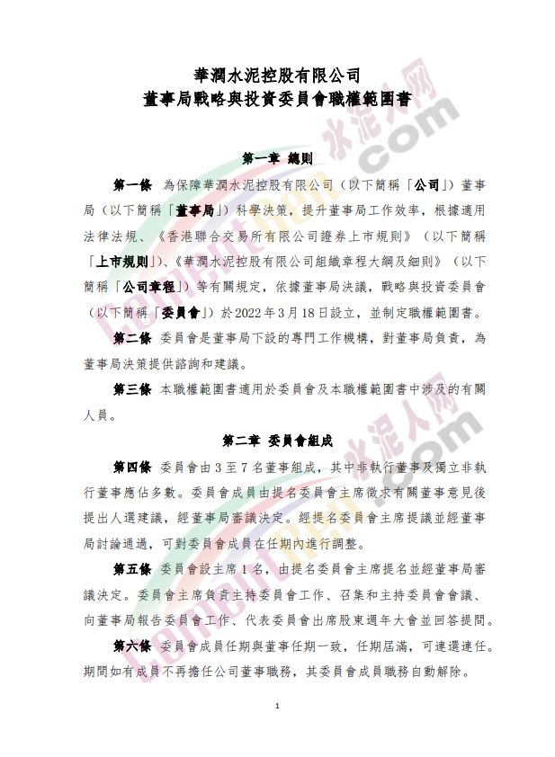 華潤(rùn)水泥控股公布,自2022年3月18日起,董事局成立戰(zhàn)略與投資委員會(huì),撤銷執(zhí)行委員會(huì),薪酬委員會(huì)更名為薪酬與考核委員會(huì),企業(yè)管治委員會(huì)更名為風(fēng)險(xiǎn)與合規(guī)委員會(huì)。