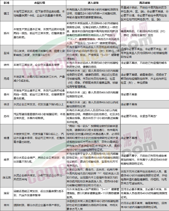江蘇多地也發(fā)現(xiàn)了疫情,為有效的疫情防控,江蘇各地級市出臺了不同政策,對進入和離開各區(qū)域提出了一定的要求,對人員流動也做了一定限制。江蘇水泥出入較頻繁的區(qū)域,受疫情影響,連云港、常州、南京地區(qū)部分水泥企業(yè)出現(xiàn)停產(chǎn)停發(fā)現(xiàn)象,其他區(qū)域水泥企業(yè)發(fā)貨正常,但發(fā)貨量均有不同程度下滑,汽運外發(fā)基本停滯,船運可正常發(fā)運,但下游需求低迷,出貨量也大幅減少。