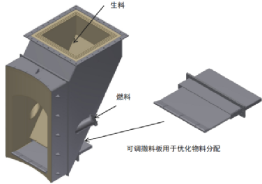 為降低系統(tǒng)內(nèi)漏風(fēng)、提高旋風(fēng)筒分離效率,將現(xiàn)有C1~C5翻板閥更換為動作靈活、鎖風(fēng)效果好的具有德國洪堡KHD專利技術(shù)的新型翻板閥,新型翻板閥的形式見圖2-1;同時對各級撒料箱更換成KHD可調(diào)節(jié)型撒料箱,并對撒料箱位置、結(jié)構(gòu)進(jìn)行了調(diào)整和優(yōu)化,撒料箱形式見圖2-2