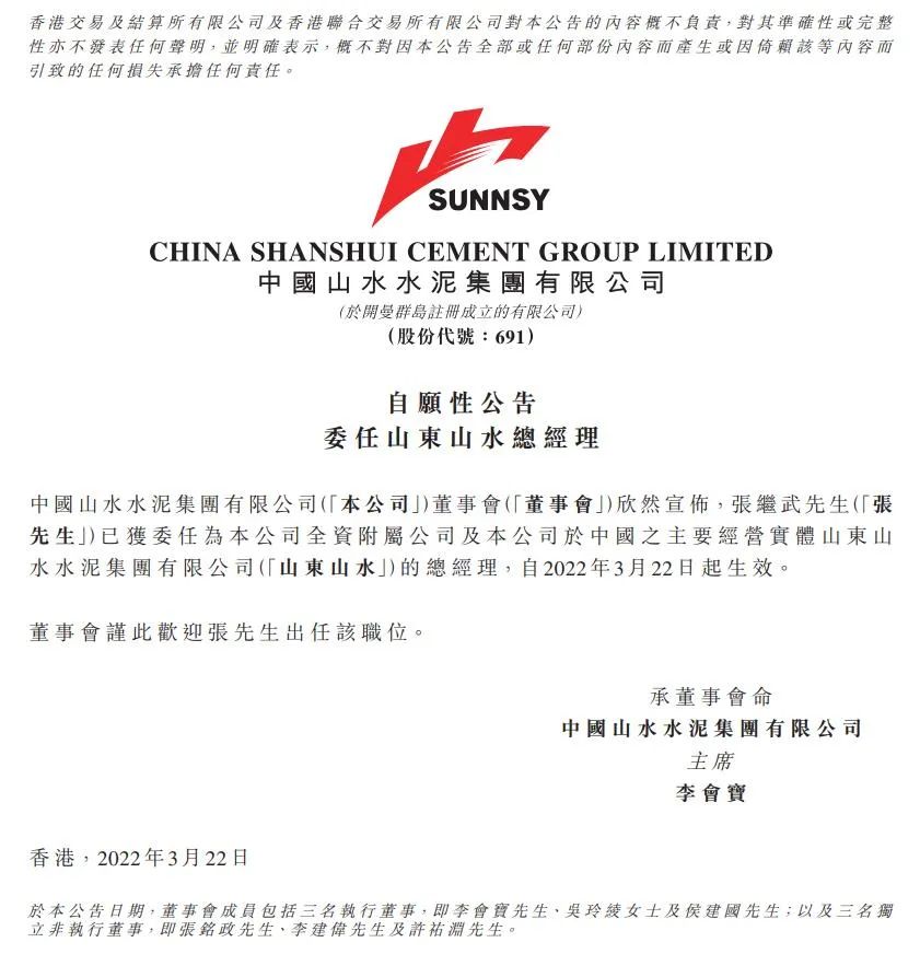 山水水泥3月22日晚間發(fā)布公告,張繼武已獲委任為公司全資附屬公司及公司于中國之主要經(jīng)營實(shí)體山東山水水泥集團(tuán)有限公司(“山東山水”)的總經(jīng)理,自2022年3月22日起生效。