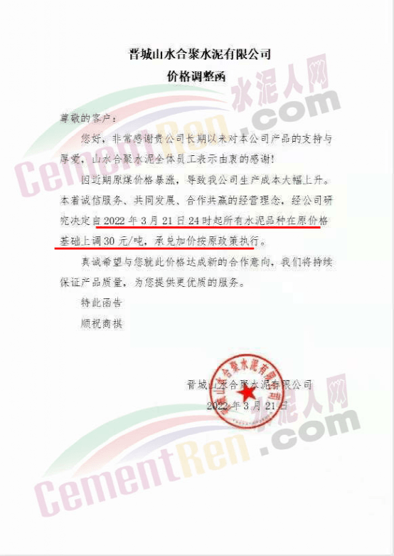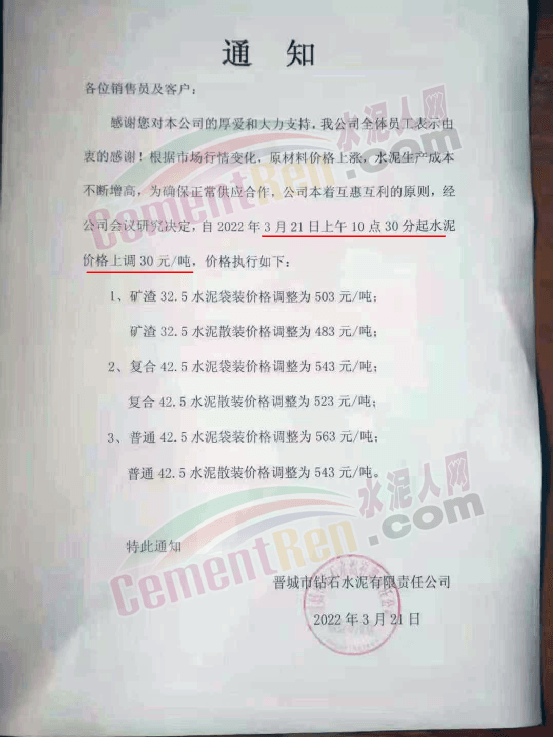 據(jù)水泥人網(wǎng)信息中心數(shù)據(jù),3月20日前后,山西多區(qū)域水泥價(jià)格通知上調(diào),山西晉城多家企業(yè)通知上調(diào)水泥價(jià)格30元/噸。晉城市鉆石水泥有限責(zé)任公司通知稱,根據(jù)市場行情變化,原材料價(jià)格上漲,水泥生產(chǎn)成本不斷增高,為確保正常供應(yīng)合作,公司本著互惠互利的原則,經(jīng)公司會議研究決定自3月21日上午10時(shí)30分上調(diào)水泥價(jià)格30元/噸,上調(diào)后礦渣32.5袋裝水泥執(zhí)行503元/噸,復(fù)合42.5袋裝水泥執(zhí)行543元/噸,普通42.5散裝水泥執(zhí)行543元/噸。