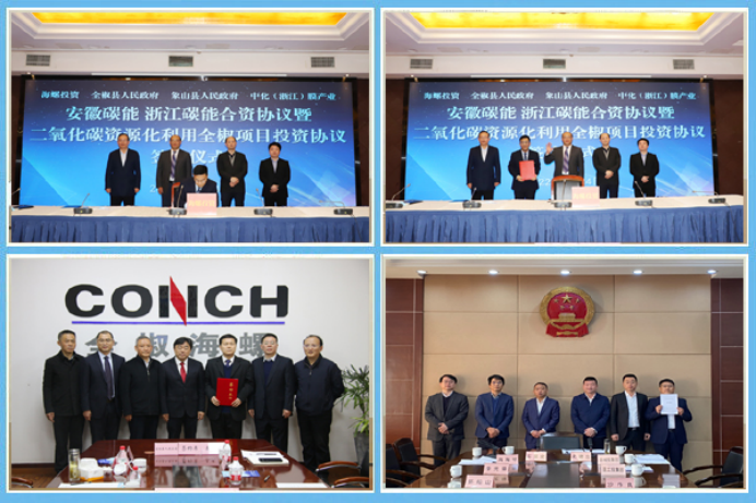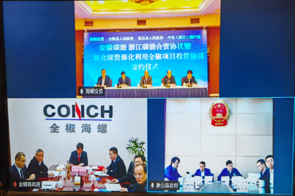 2022年3月24日上午,海螺投資公司與全椒縣政府、象山縣政府、中化膜產(chǎn)業(yè)公司通過(guò)云簽約形式,正式簽署安徽碳能、浙江碳能合資協(xié)議以及二氧化碳資源化利用全椒項(xiàng)目投資協(xié)議。全椒縣、象山縣主要領(lǐng)導(dǎo)及相關(guān)部門負(fù)責(zé)同志,中化膜產(chǎn)業(yè)公司總經(jīng)理周海明,海螺集團(tuán)黨委委員、總經(jīng)濟(jì)師、海螺投資總經(jīng)理丁鋒,海螺投資總經(jīng)理助理程竹松、海螺集團(tuán)戰(zhàn)略企劃部副部長(zhǎng)盧叔敏等出席儀式并見(jiàn)證簽約。