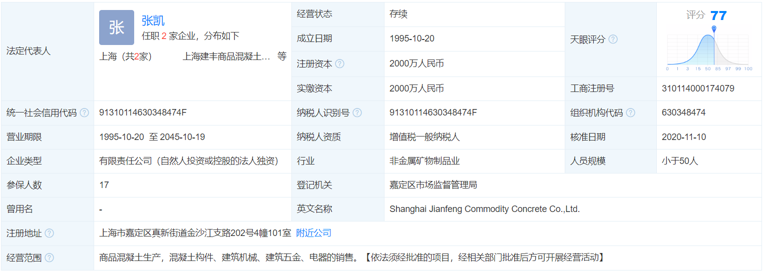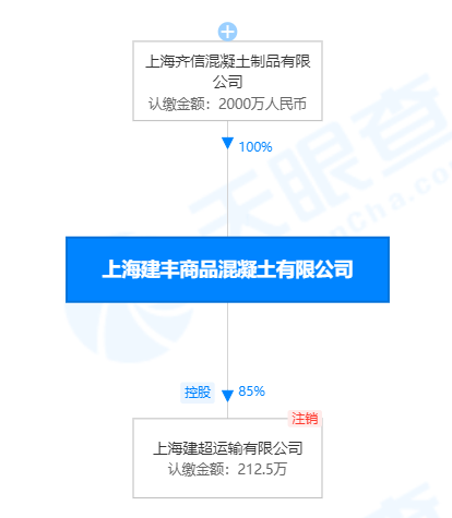 據(jù)天眼查查詢結(jié)果顯示,上海建豐商品混凝土有限公司成立于1995年,注冊資本2000萬人民幣,是上海齊信混凝土制品有限公司的子公司,主要經(jīng)營范圍為商品混凝土生產(chǎn),混凝土構(gòu)件、建筑機械、建筑五金、電器的銷售。