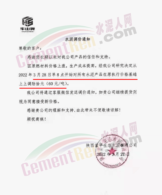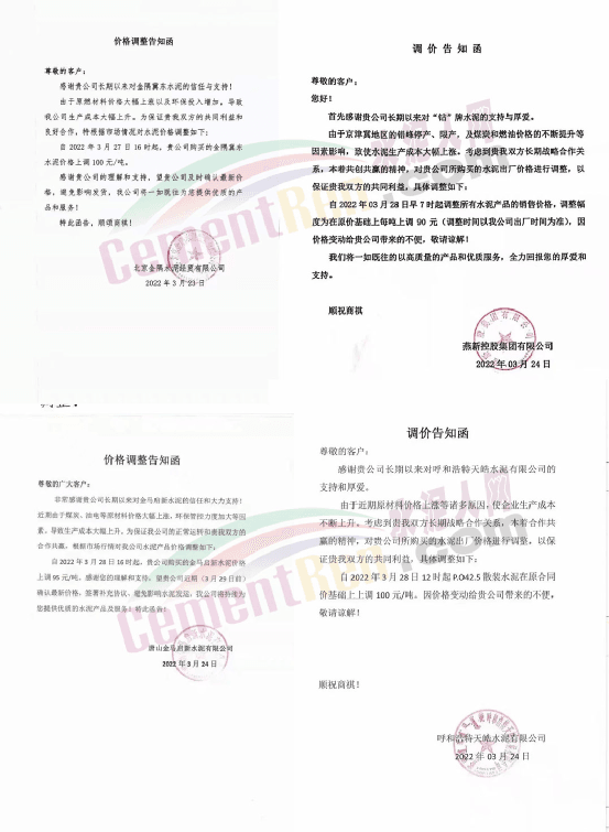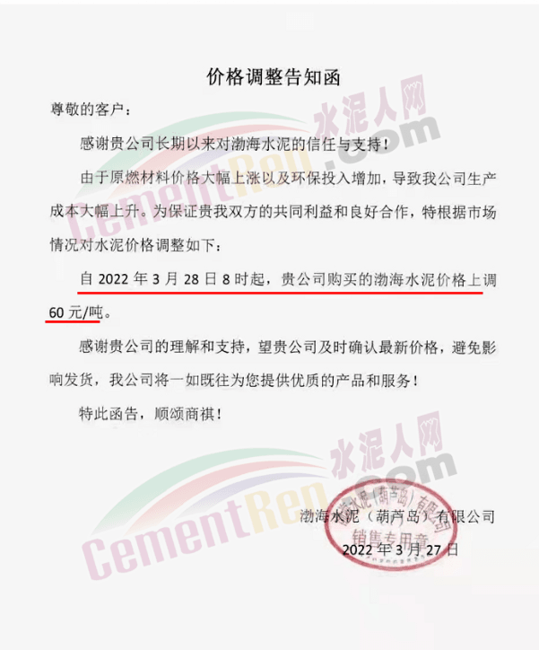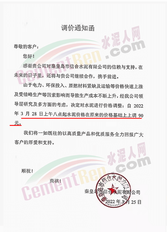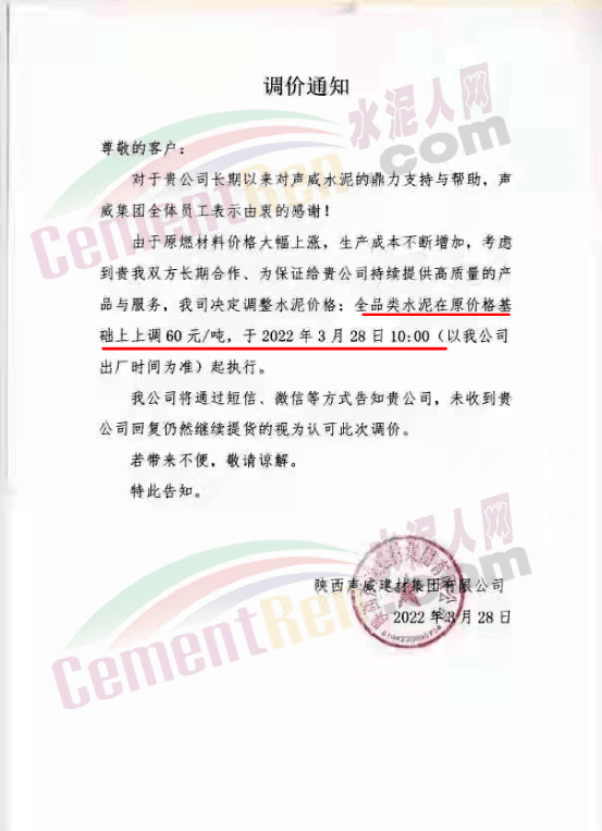 天津天旺崇正水泥有限責(zé)任公司銷售公司水泥調(diào)價(jià)告知函稱,因近期原材料特別是熟料價(jià)格大幅上漲,造成水泥生產(chǎn)成本持續(xù)增長,經(jīng)公司研究決定自3月28日上午8時(shí)起,對各品種水泥出廠價(jià)上調(diào)80元/噸。