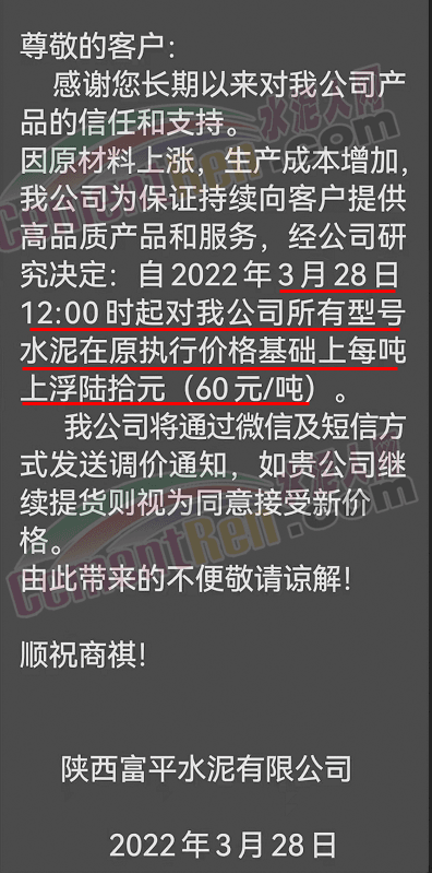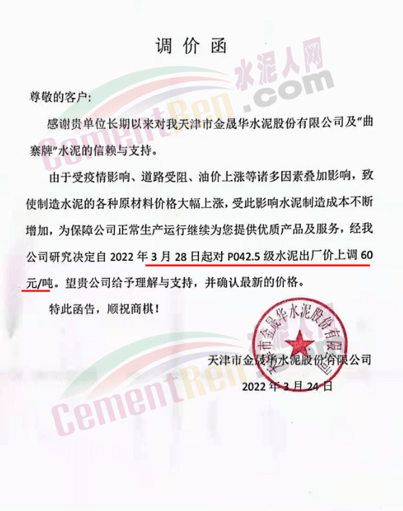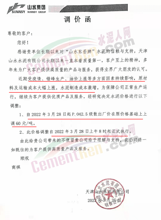 天津山水水泥有限公司調(diào)價(jià)函稱,近期受疫情、錯(cuò)峰生產(chǎn)、油價(jià)上漲等多方面因素持續(xù)影響,原材料及運(yùn)輸成本大幅上漲,水泥制造成本激增。為保障公司正常生產(chǎn)運(yùn)行,繼續(xù)為客戶提供優(yōu)質(zhì)產(chǎn)品及服務(wù),經(jīng)廠家決定水泥價(jià)格自3月28日上午8時(shí)起P.O42.5散裝水泥上調(diào)60元/噸。