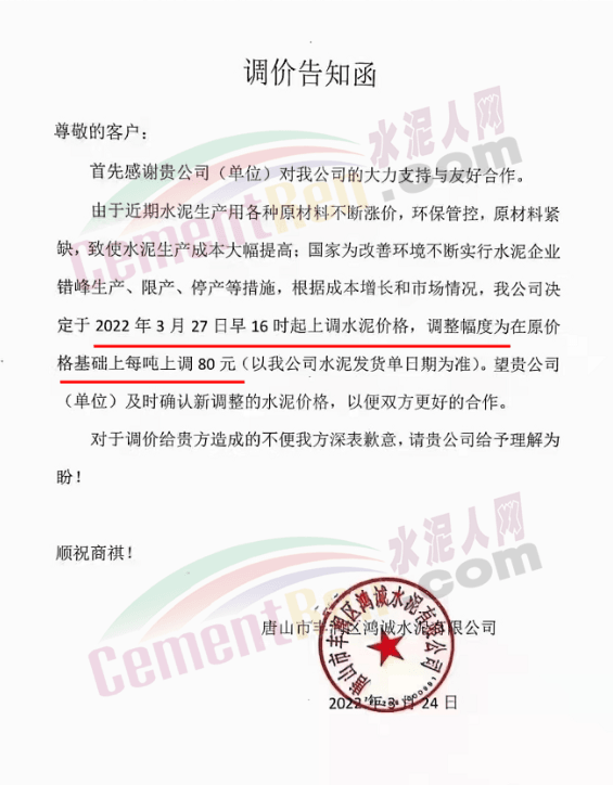 唐山市豐潤區(qū)鴻誠水泥有限公司通知,3月27日16時(shí)起上調(diào)水泥價(jià)格80元/噸。