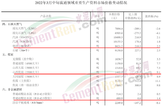 國家統(tǒng)計(jì)局?jǐn)?shù)據(jù)顯示,2022年3月中旬流通領(lǐng)域石油、天然氣、煤炭、P.O42.5散裝水泥較3月上旬同比均為上漲,其中0號柴油上漲210.3元/噸,漲幅2.5%;山西優(yōu)混550大卡煤炭上漲121.9元/噸,漲幅9.1%;P.O42.5散裝水泥上漲6.6元/噸,漲幅1.4%。