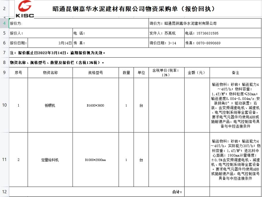近日,昭通昆鋼嘉華水泥建材有限公司發(fā)布一條物資采購單,其需要采購一臺(tái)規(guī)格型號(hào)為B1600*3600的板喂機(jī)。其參數(shù)為,輸送物料:砂巖;輸送能力4~40T/h;物料容重:1.4T/M3;