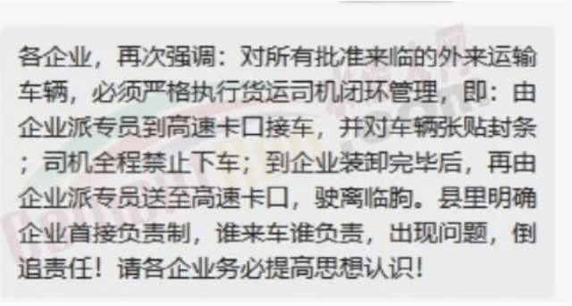 臨朐企業(yè)收到通知強(qiáng)調(diào),對所有批準(zhǔn)來臨的外來運(yùn)輸車輛,必須嚴(yán)格執(zhí)行貨運(yùn)司機(jī)閉環(huán)管理,即:由企業(yè)派專員到高速卡口接車,并對車輛張貼封條;司機(jī)全程禁止下車;到企業(yè)裝卸完畢后,再由企業(yè)派專員送至高速卡口,駛離臨朐??h里明確企業(yè)首接負(fù)責(zé)制,誰來車誰負(fù)責(zé),出現(xiàn)問題,倒追責(zé)任!