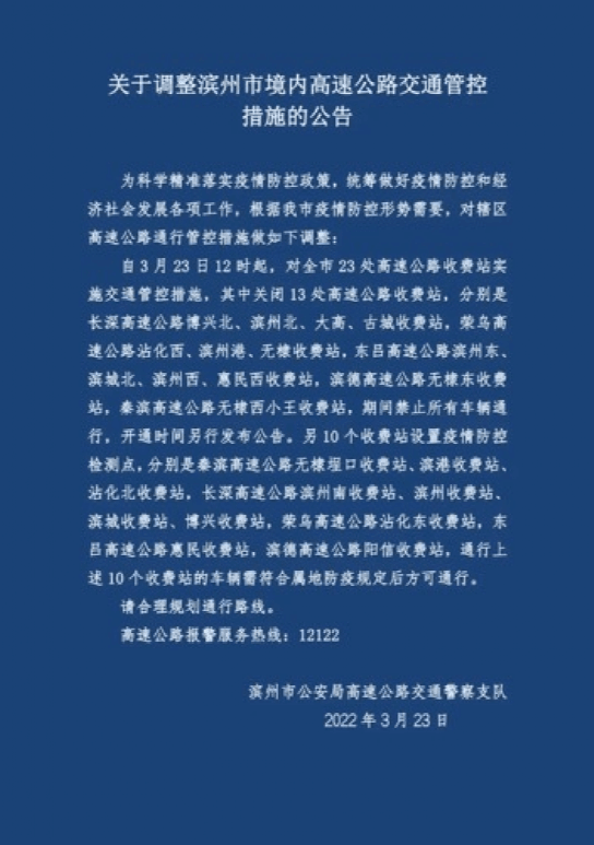 濱州市公安局高速交警支隊(duì)通知,自3月23日12時(shí)起,對全市23處高速公路收費(fèi)站實(shí)施交通管控措施,其中關(guān)閉13 處高速公路收費(fèi)站,開通時(shí)間另行發(fā)布公告。另10個(gè)收費(fèi)站設(shè)置疫情防控檢測點(diǎn),車輛需符合屬地防疫規(guī)定后方可通行。