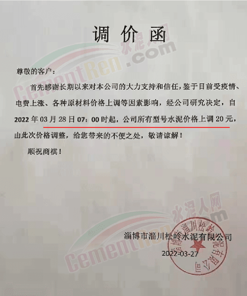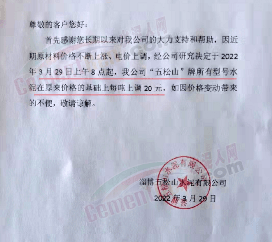 淄博市淄川松嶺水泥有限公司通知,鑒于目前受疫情、電費(fèi)上漲,各種原材料價(jià)格上調(diào)等因素影響,經(jīng)公司研究決定,自3月28日7時(shí)起,公司所有型號水泥價(jià)格上調(diào)20元/噸。