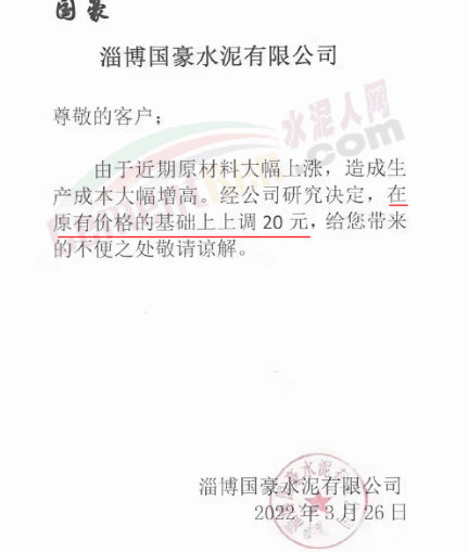 淄博國豪水泥有限公司通知,由于近期原材料大幅上漲,造成生產(chǎn)成本大幅增高,經(jīng)公司研究決定,在原有價(jià)格基礎(chǔ)上上調(diào)20元/噸。
