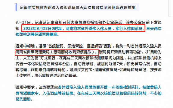 據(jù)了解,河南省新冠肺炎疫情防控指揮部辦公室近期曾下發(fā)通知,自3月22日0時(shí)起對省外返豫入豫人員,實(shí)行入豫即賦黃碼,三天兩檢等健康管理措施。