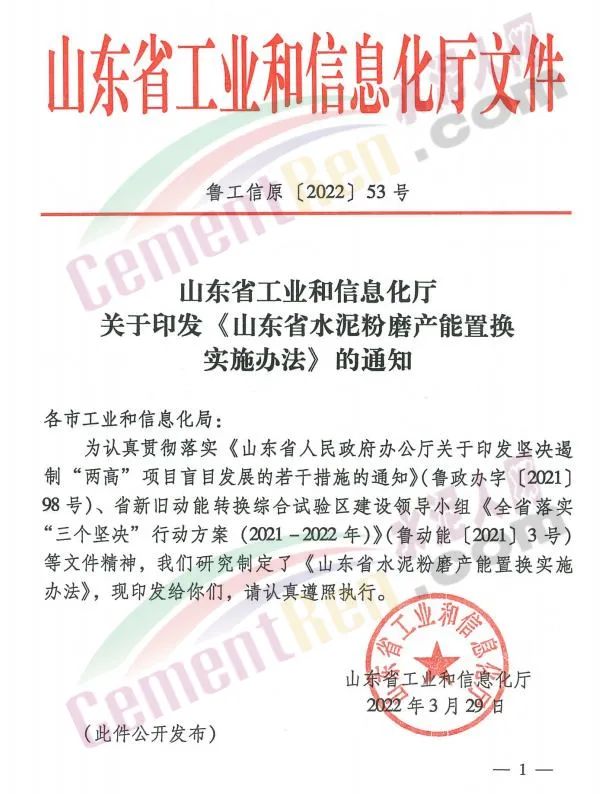 2022年3月29日,山東省工業(yè)和信息化廳發(fā)布了《山東省水泥粉磨產(chǎn)能置換實施辦法》,要求: