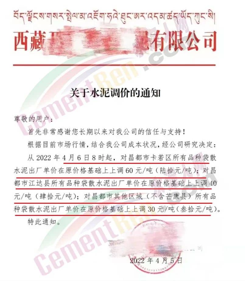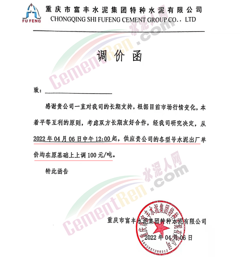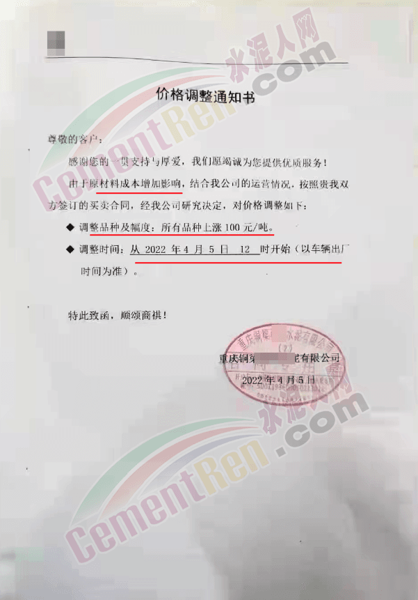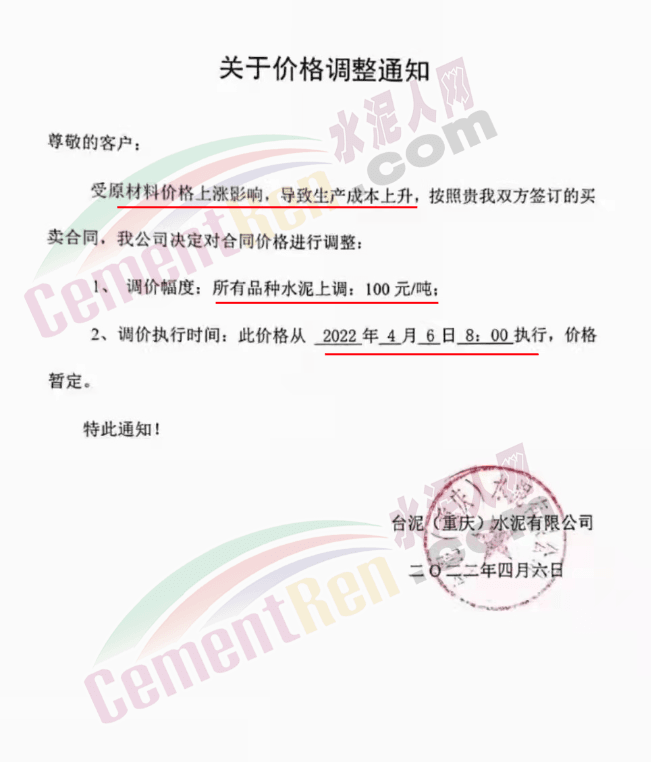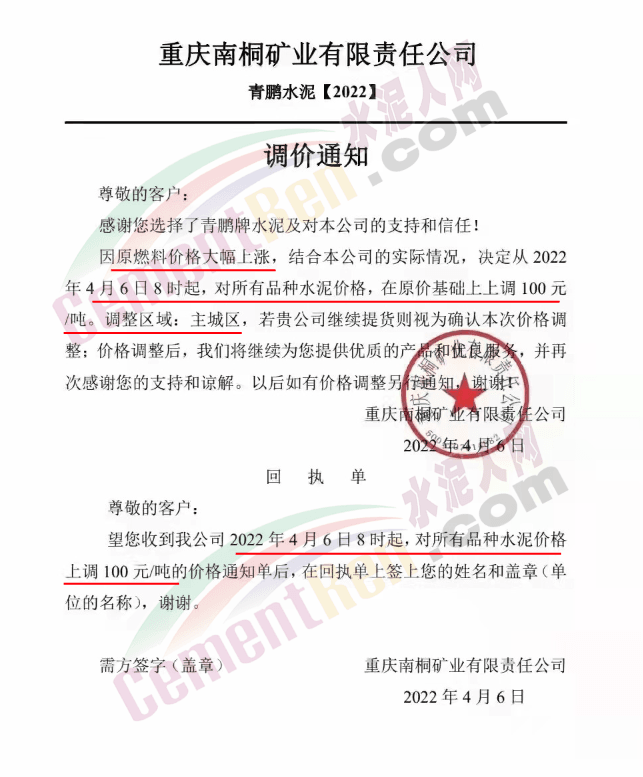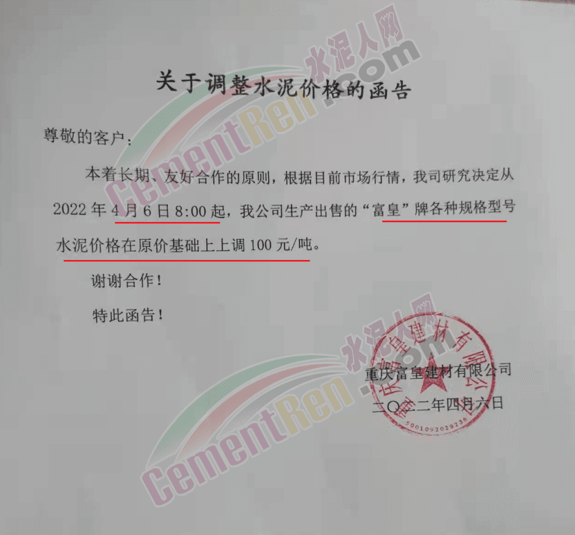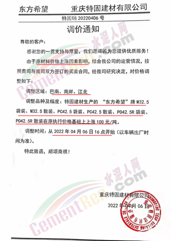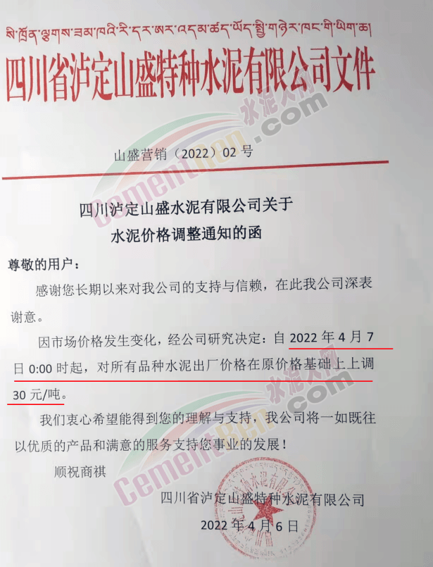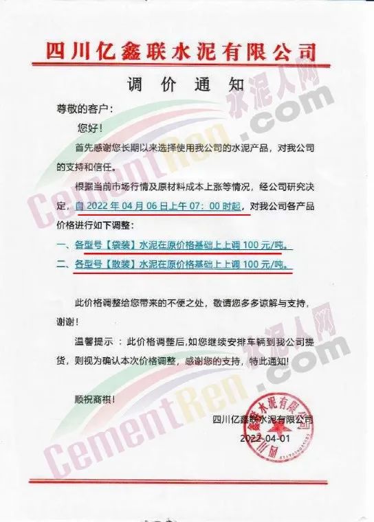 四川億鑫聯(lián)水泥有限公司通知,根據(jù)當(dāng)前市場行情原材料成本上漲等情況,經(jīng)公司研究決定自4月6日上午7時起,對各型號水泥在原價基礎(chǔ)上上調(diào)100元/噸。