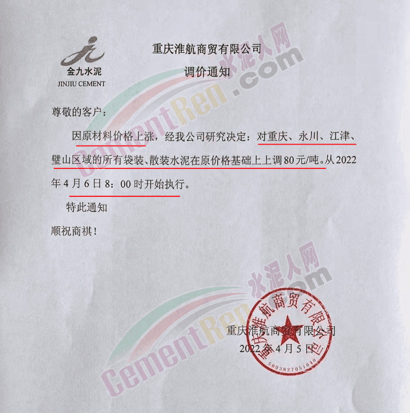 重慶淮航商貿(mào)有限公司通知,因原材料價格上漲,經(jīng)公司研究決定從4月6日8時起對重慶 、永川、江津、璧山區(qū)域的所有袋裝、散裝水泥上調(diào)80元/噸。