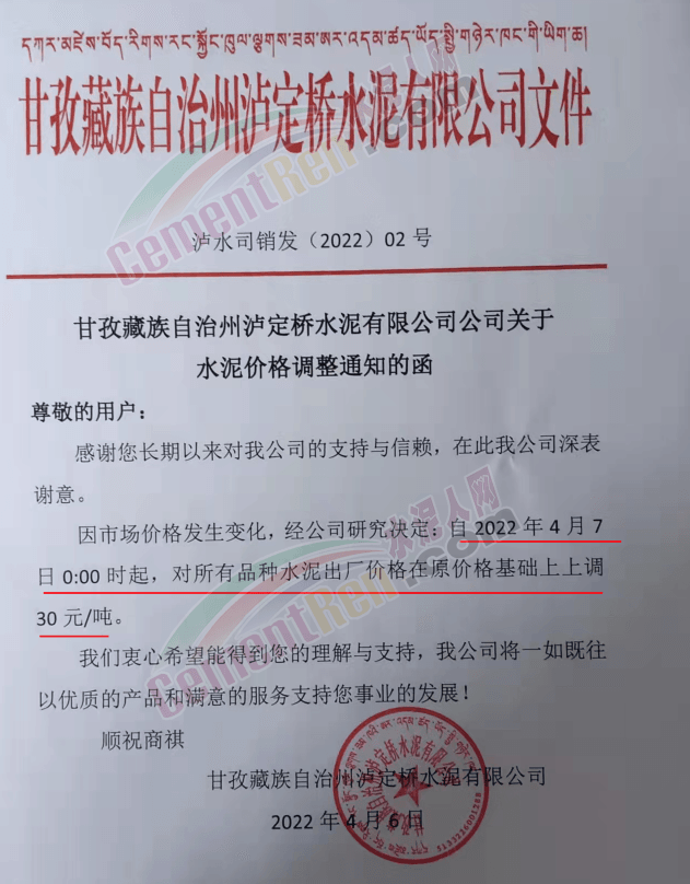 四川甘孜藏族自治州瀘定橋水泥有限公司及瀘定山盛特種水泥有限公司兩家水泥企業(yè)通知,因市場價格發(fā)生變化,經(jīng)公司研究決定上調(diào)水泥價格30元/噸。