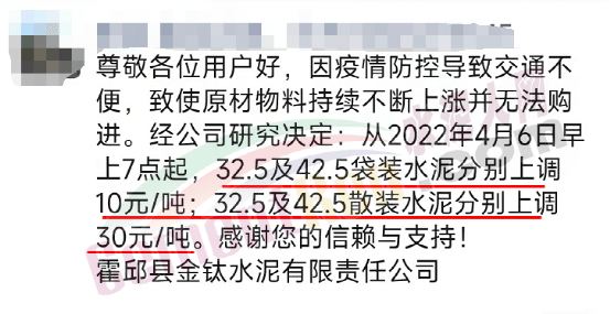 安徽六安霍邱縣金鈦水泥有限責(zé)任公司發(fā)通知稱,因疫情防控導(dǎo)致交通不便,致使原材物料持續(xù)不斷上漲并無法購進。經(jīng)公司研究決定從2022年4月6日早上7點起,32.5及42.5袋裝水泥分別上調(diào)10元/噸;32.5及42.5散裝水泥分別上調(diào)30元/噸。