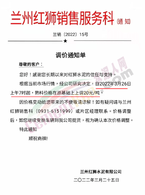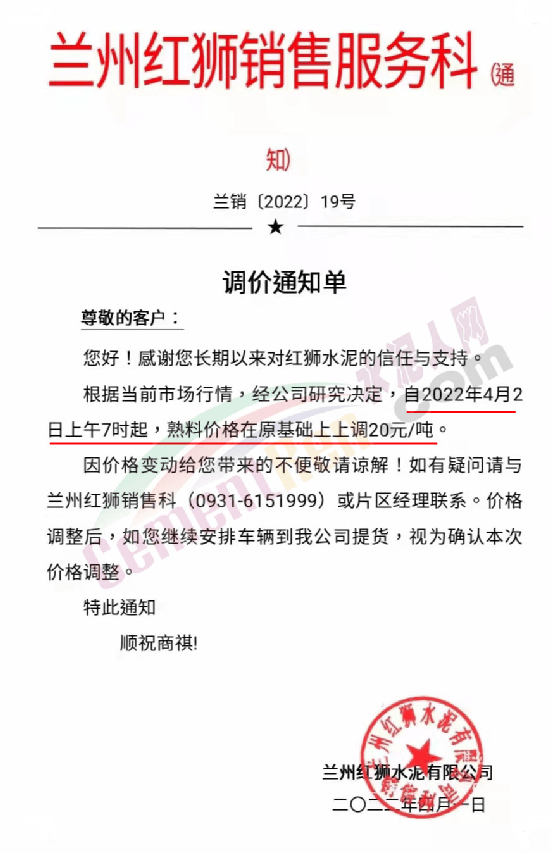 蘭州紅獅銷售服務(wù)科通知。根據(jù)當(dāng)前市場行情,經(jīng)公司研究決定,自2022年4月2日上午7時起,熟料價格在原基礎(chǔ)上上調(diào)20元/噸。據(jù)了解,這是蘭州紅獅近一個月來的第二次熟料調(diào)價,企業(yè)還曾于3月26日上調(diào)熟料價格20元/噸,兩次調(diào)價累計上調(diào)40元/噸。