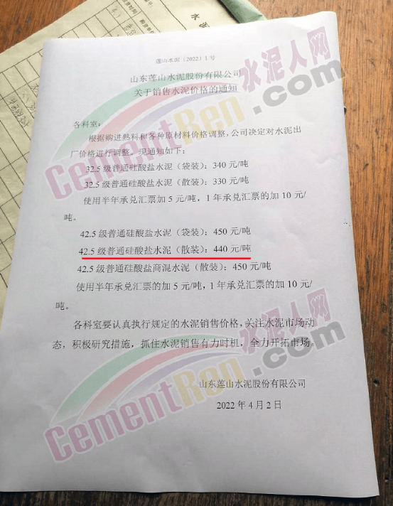 4月2日,山東蓮山水泥通知稱,根據(jù)購進熟料和各種原材料價格調(diào)整,公司決定對水泥出廠價格進行調(diào)整,調(diào)整后42.5級散裝水泥報價440元/噸,商混用散裝42.5普通硅酸鹽水泥報價450元/噸,半年承兌匯票加5元/噸,1年承兌匯票加10元/噸。