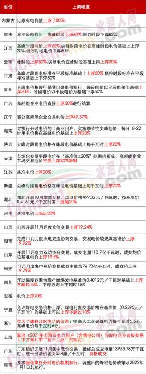 各區(qū)域電價上浮比例一覽