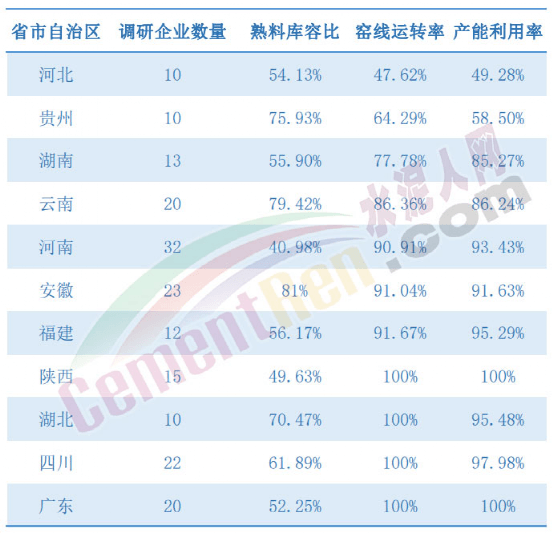 部分區(qū)域熟料庫容比及產(chǎn)能利用率一覽