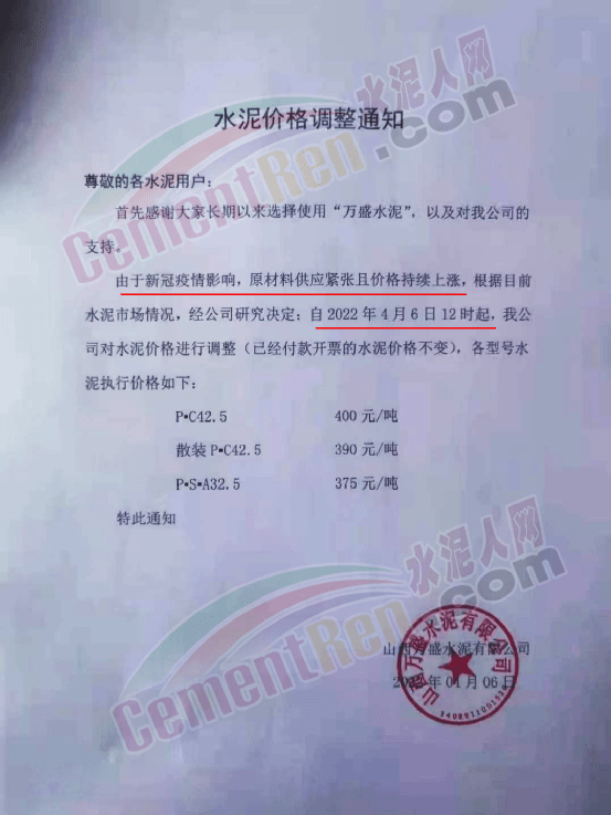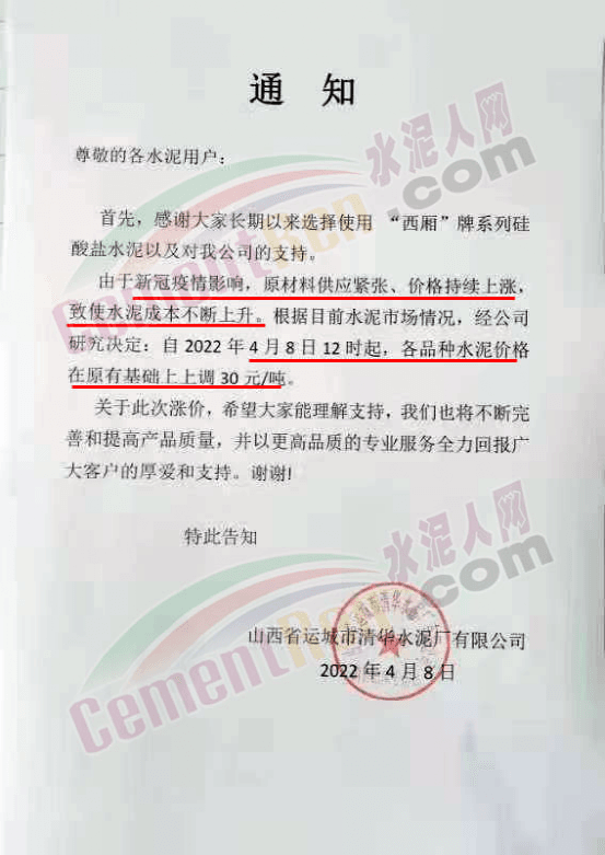 同日,山西運城多家水泥企業(yè)通知因新冠疫情影響,原材料供應緊張,價格持續(xù)上漲,致使水泥成本不斷上升,根據(jù)目前情況經(jīng)公司研究決定上調(diào)水泥價格。