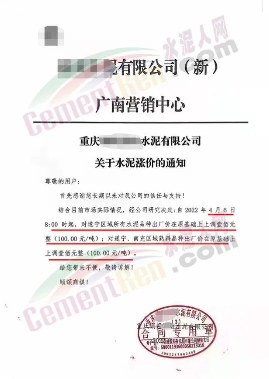 廣東惠州市光大水泥企業(yè)有限公司通知從2022年4月7日0時起,公司和興水泥廠供應給貴公司的P.O42.5R包裝水泥在原有價格的基礎上上調(diào)15元/噸;光大水泥供應給貴公司銷往惠州區(qū)域(含河源片區(qū))的P.O42.5R包裝水泥在原有價格的基礎上上調(diào)30元/噸;其他條款按原合同執(zhí)行。