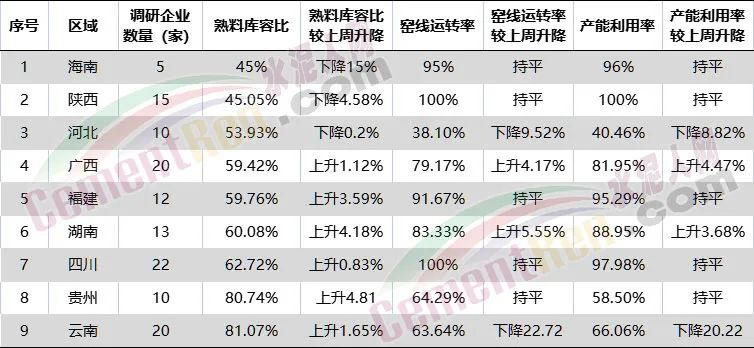 截止周五(4月8日),海南、陜西、河北、廣西、福建、湖南、四川、貴州、云南9個省市自治區(qū)熟料庫容比同比上周“六升三降”,窯線運轉(zhuǎn)率和產(chǎn)能利用率較上周同比“二升二降五平”。其中云南、貴州熟料庫容比均在80%以上,窯線運轉(zhuǎn)率、產(chǎn)能利用率同比出現(xiàn)20%以上的下降。