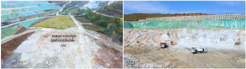 環(huán)保設(shè)施完善,實現(xiàn)了環(huán)境動態(tài)監(jiān)測,礦山開采采用自上而下的分臺階式開采工藝,科學(xué)布局。穿孔粉塵集中收集,自動噴淋裝置對作業(yè)平臺和運礦道路進(jìn)行灑水降塵、霧炮機(jī)對料堆進(jìn)行增濕控塵。一幅完整的無塵式生態(tài)開采流程圖完美呈現(xiàn)在青山綠水之間。