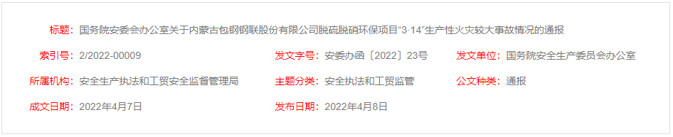 近日,國務(wù)院安委會辦公室通報了關(guān)于內(nèi)蒙古包鋼鋼聯(lián)股份有限公司脫硫脫硝環(huán)保項目“3·14”生產(chǎn)性火災(zāi)較大事故的情況。