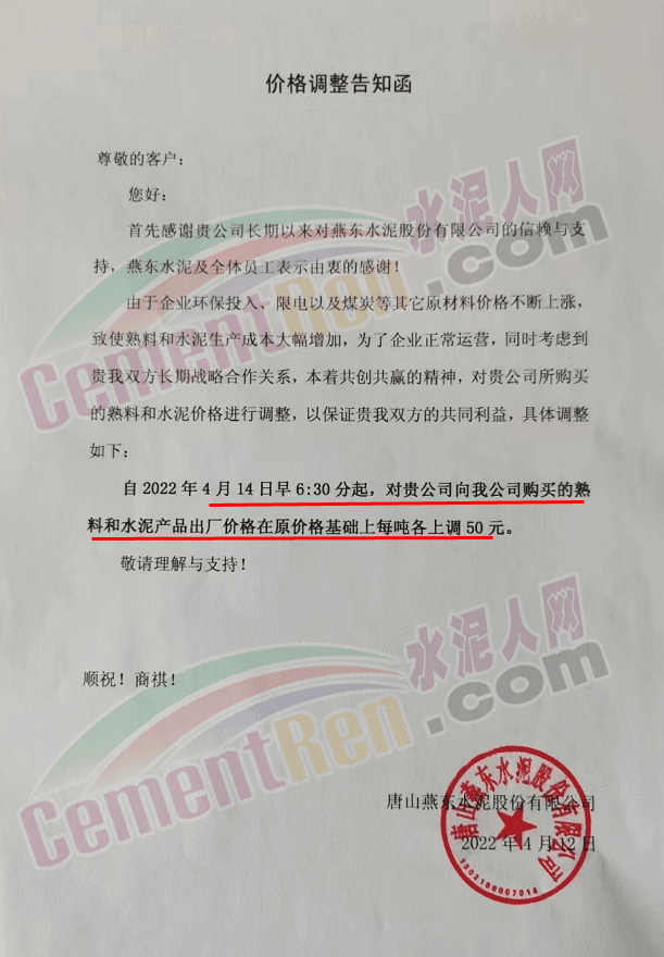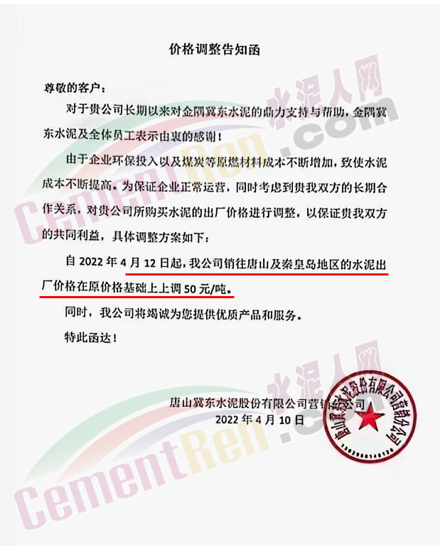 唐山冀東水泥股份有限公司唐山營銷分公司通知自4月12日起,公司銷往唐山及秦皇島地區(qū)地水泥出廠價在原價基礎(chǔ)上上調(diào)50元/噸。