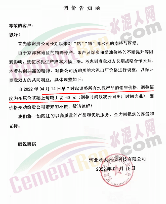河北承大環(huán)??萍加邢薰就ㄖ?月14日早7時起,上調(diào)所有水泥產(chǎn)品的銷售價格60元/噸。