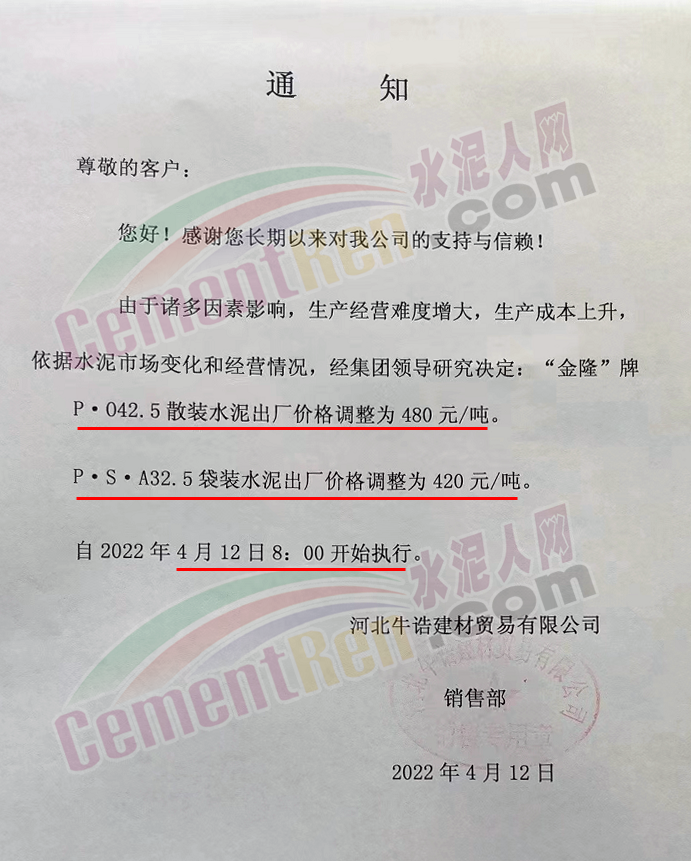 河北牛誥建材貿(mào)易有限公司通知由于諸多因素影響,生產(chǎn)經(jīng)營難度增大 ,生產(chǎn)成本上升,依據(jù)水泥市場變化和經(jīng)營情況,經(jīng)集團領(lǐng)導(dǎo)研究決定,自4月12日8時起“金隆”牌P.O42.5散裝水泥出廠價480元/噸,P.S.A32.5袋裝水泥出廠價調(diào)整為420元/噸。