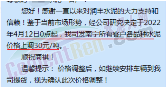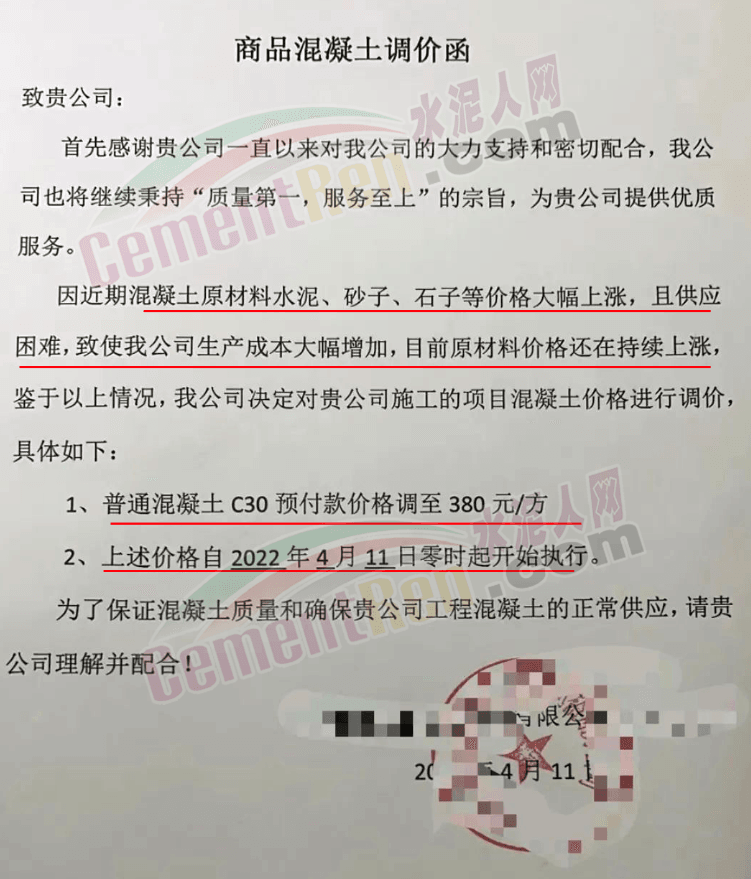 另一企業(yè)調(diào)價通知提到,原材料價格持續(xù)上漲,造成混凝土成本大幅上漲,公司通過內(nèi)部控制挖潛已經(jīng)無法克服原材料持續(xù)上漲帶來的成本壓力,為確?;炷临|(zhì)量,滿足供應(yīng),經(jīng)過多方面考慮,決定自4月12日起上調(diào)價格30元/立方。