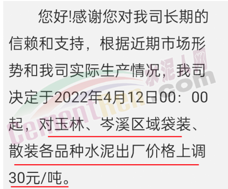 河北中達(dá)集團有限責(zé)任公司水泥廠通知由于疫情原因各原材料供應(yīng)不足,價格持續(xù)上漲,環(huán)保管控力度加大等諸多因素影響,生產(chǎn)經(jīng)營難度增大,生產(chǎn)成本上升,為保證公司的正常生產(chǎn)經(jīng)營,各品種水泥自4月12日上午8時在原價基礎(chǔ)上上調(diào)30元/噸。