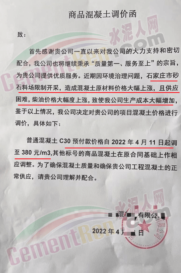 另一企業(yè)通知稱,近期因環(huán)境治理問題,石家莊市砂石料場限制開采,造成混凝土原材料價格大幅上漲,且供應(yīng)困難,柴油價格大幅度上漲,致使公司生產(chǎn)成本大幅增加,鑒于以上情況,公司決定自4月11日起普通混凝土C30預(yù)付款價格調(diào)至380元/立方。其他標(biāo)號的商品混凝土在原合同基礎(chǔ)上作相應(yīng)調(diào)整 。